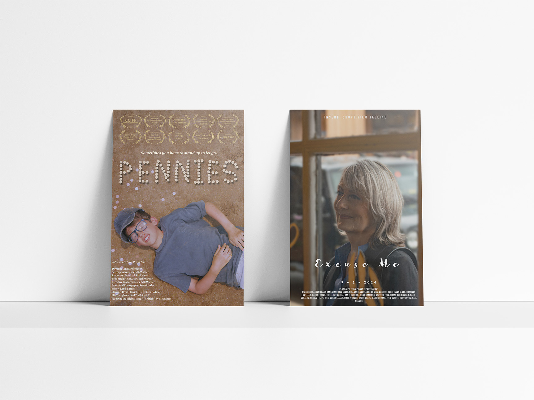 Poster designs for Excuse Me and Pennies, short films produced by Pennies Pictures